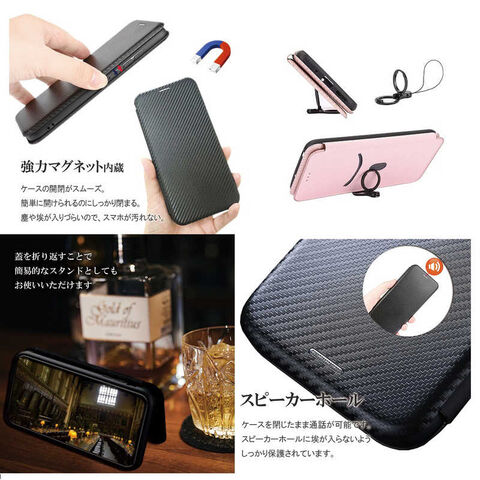 ●カーボンファイバーの素材を活かしたデザイン。手帳型ケースの開閉部にはマグネットを採用。 しっかり閉じられ、簡単に開くこともできる機能。埃やごみが入りづらくiPhone本体をガードします。