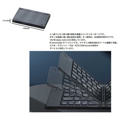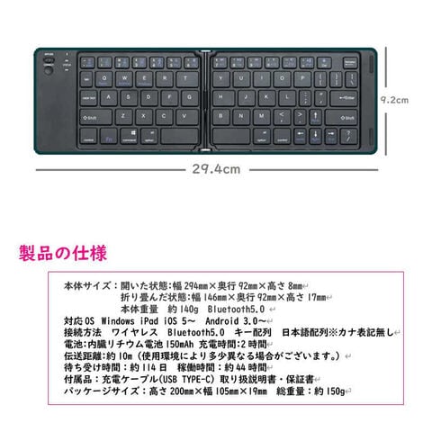 対応OS Windows iPad iOS 5~ Android 3.0~接続方法 ワイヤレス Bluetooth5.0 キー配列 日本語配列※カナ表記無し電池:内臓リチウム電池150mAh 充電時間:2時間伝送距離:約10m(使用環境により多少異なる場合がございます。