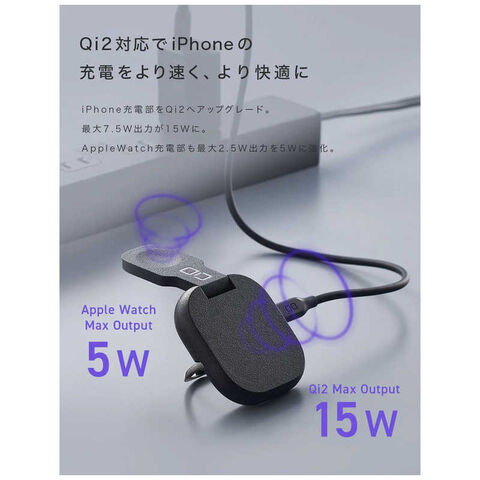 コンパクトなフォルムにQi2認証チップ搭載の最大15W出力と最大5W出力、2つの充電器が搭載され、マグネット吸着により適切な位置でのワイヤレス充電が可能です。