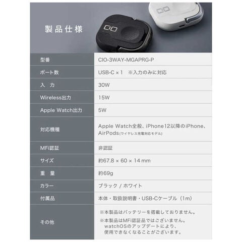 定格出力電力:[ワイヤレス]:15W Max、[AppleWatch]:5W Max