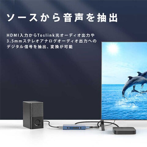 インターフェイス:HDMI-Aメス/3.5mm TRSメス/Toslink光メス/DC電源電気メッキ:ニッケルメッキ解像度:4K@60シェル:アルミニウム合金+ABS電源:5V/1A保証:1年パッケージ:カラーボックスアクセサリ:DC電源コード0.8m×1 IR Remoteコントロール×1