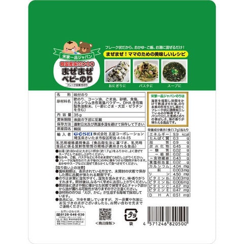 原材料名:乾のり、コーン油、ごま油、砂糖、食塩、カルシウム含有海藻パウダー、DHA含有有精製魚油粉末(一部にごま、大豆、ゼラチンを含む)