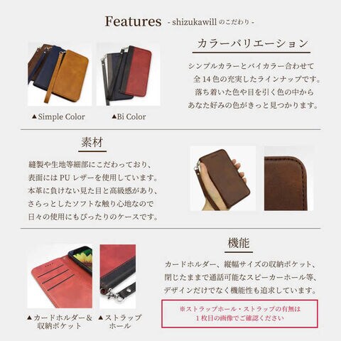 仕様1:ケースタイプ:Leather 手帳型ケース付属品:専用フック付ストラップ素 材:TPU(熱可塑性ポリウレタン) PUレザー(ポリウレタン樹脂)仕 様:耐衝撃・衝撃吸収注意事項:磁石を使用した製品となるため、磁気記憶型カードの収納、通帳類との接触は非推奨