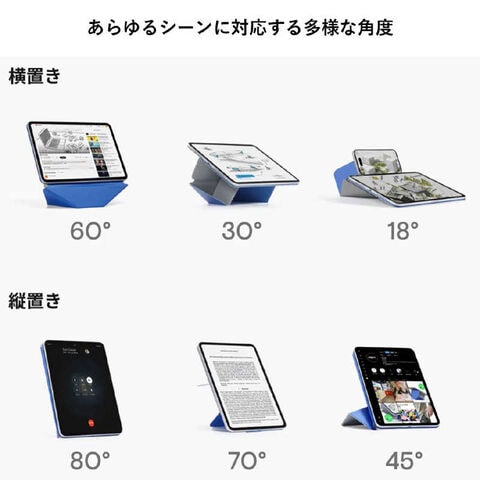 紙のような超薄型カバーをさっと展開するだけで様々な形状で使えるスタンドに早変わり。