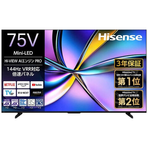 ハイセンス 液晶テレビ [ 75V型 / 4Kチューナー内蔵 / YouTube 対応 ] 75U7R(標準設置無料)