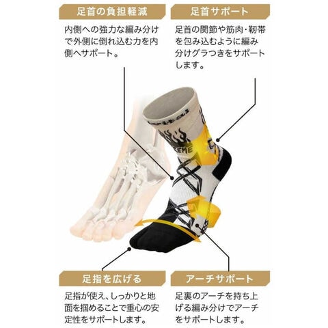 特許取得の編み組織が可能にする足首の安定感、足指を強く使える5本指形状が生む質の高いサポート性。