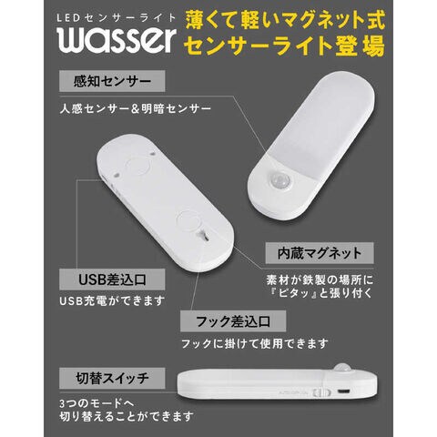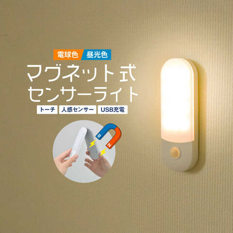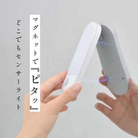 )(規格)サイズ:約H125mmxW45mm×D20mm重さ:約47g電源:5V DC消費電力:約0.65W(最大)フル充電時間:約2時間連続使用時間:約3.5時間センサー反応距離:約3mまで内蔵バッテリー:リチウムイオンバッテリー3.7V(約500mA)光源:LED×12灯光色:電球色または昼光色光束:約60ml素材:ABS/PC保証:6ヶ月(セット内容)本製品×1、Micro USB充電コード×1、両面テープ(約7cm)×1、メタルプレート(約7cm)×1