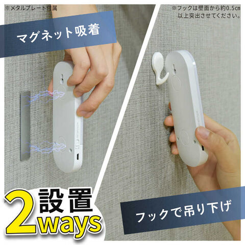 ●背面にフック差し込み口がついているので、引っ掛けて設置もOK!●充電式&内蔵マグネットでスッキリしたデザインに。