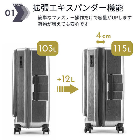 サイズ:78×45×34cm(拡張時:78×45×38cm)容 量:103L(拡張時:115L)重 量:5.2kg素 材:PC100%(ポリカーボネート)ロック:TSAダイヤルロックキャスター:静音・ロック機能付きダブルキャスター 【選べる3カラー】