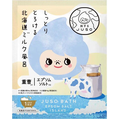 「旅する入浴料」JUSO BATH POWDER。重曹成分※1が肌の汚れを落としてお風呂ですべすべ肌に! 温泉のようなつるつるとした湯質が特徴。エプソムソルト※2、有機ゲルマニウム※3配合。「ミルク※4 」成分入りでしっとりミルク風呂。
