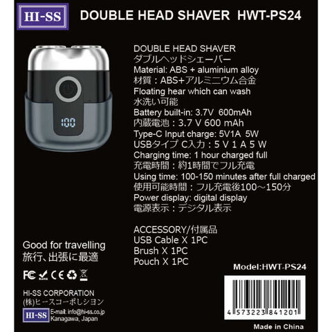 ダブルヘッドシェーバー 水洗い可能 内蔵電池 600mAh USB Type-C入力 約1時間でフル充電 フル充電後100~150分使用可能 バッテリー残量をデジタル表示