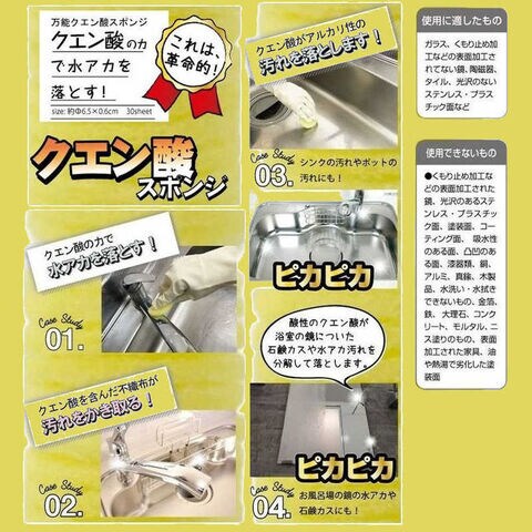 万能クエン酸スポンジのクエン酸の力で水アカや石鹸カスなどアルカリ性の汚れに効果を発揮します。