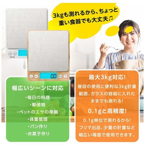 管理栄養士がオススメ!日本地域設定機能付きのデジタルキッチンスケール。0.1g単位の精密計測から最大3kgまで対応し、料理やお菓子作り、コーヒーの抽出まで幅広く活躍。スタイリッシュなデザインでキッチンを彩り、便利なトレー2枚も付属した、おしゃれで実用的な必需品です。