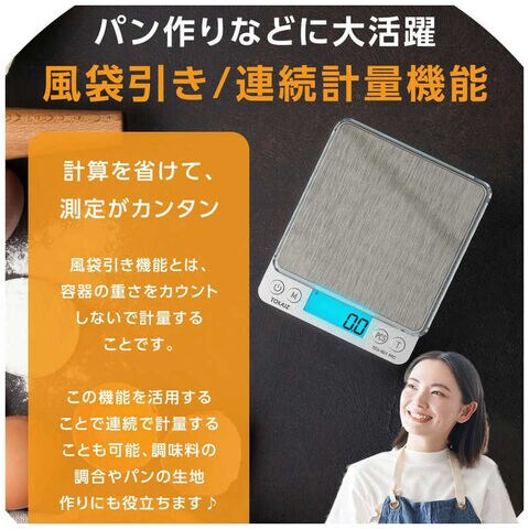 調理用はもちろん、茶葉・粉末調味料・粉ミルクなどの計量にも対応。日常から専門用途まで使いやすいデジタルスケールです。