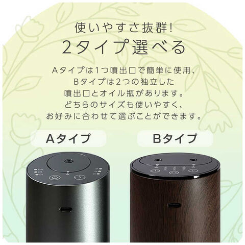 仕様1:・タイマー選択:1時間/2時間/3時間/4時間・噴霧出力選択:弱-3分間に15秒噴霧/中-3分間に60秒噴霧/強-3分間に120秒噴霧・対応オイル種類:発揮性エッセンシャルオイル/アロマディフューザー対応アロマオイル・本体サイズ:69×69×138mm・本体質量:約308g・充電ポート:USB-C・定格入力:DC5V/1A・バッテリー容量:2000mAh・付属品:本体、USB Type-C充電ケーブル、取扱説明書兼保証書