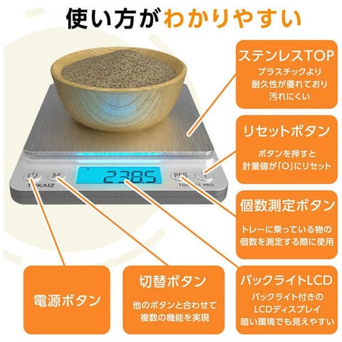 調理用はもちろん、茶葉・粉末調味料・粉ミルクなどの計量にも対応。日常から専門用途まで使いやすいデジタルスケールです。