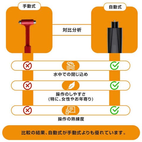 2つのハンマーでより速く、安定してガラスを破砕可能。緊急時の脱出を強力にサポートします。