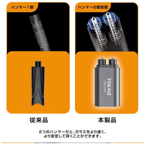2つのハンマーでより速く、安定してガラスを破砕可能。緊急時の脱出を強力にサポートします。