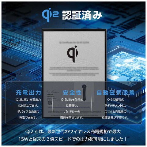 最新規格Qi2に対応し、iPhone&Androidともに最大15Wの急速充電が可能。※従来Qi対応のiPhoneは最大7.5Wまで