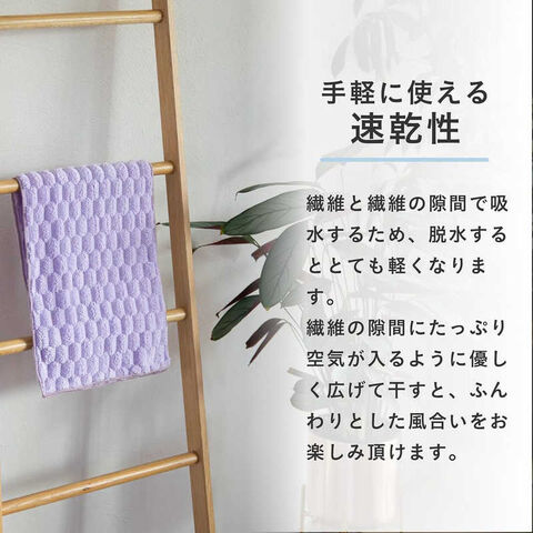 ずっと触りたくなるようなポコポコ肌触り。特殊な織り方で、ポコポコとした立体構造を再現したマイクロファイバータオル。触れる表面積を増やすことによって、髪の毛や肌にフィットして素早く吸水してくれます。ゴシゴシと拭かず、そっと肌に当てるだけで吸水してくれます。マイクロファイバーならではのマシュマロのような肌触りに加えて、ポコポコの感触はクセになりそう!これまでのマイクロファイバータオルとは違った新しさをお楽しみ下さい。ふんわり軽いのに、驚くほどの吸水力!繊維と繊維の隙間でまるでスポンジのように吸水してくれます。さらにポコポコの立体構造で触れる面積が多いので、髪の毛に巻いてヘアドライにも大活躍です。たっぷり吸水した後も脱水すると一気に軽くなり、速乾性にも優れています。部屋干しが多くなる季節でも安心です。