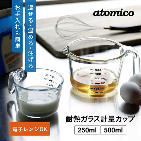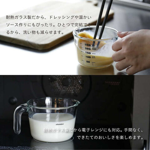 atomicoのガラス計量カップは、見た目にもすっきりと美しく、量る・混ぜる・温める・注ぐ…すべての工程がこれひとつで完了します。