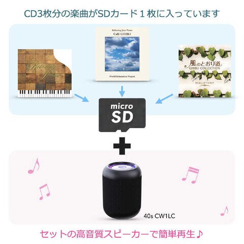 本コラボ商品用にDella社のマスター音源から抽出し制作した高品質データ入りSDカードを、40sブランドのBluetoothスピーカー本体と組み合わせて販売するセット商品となります。