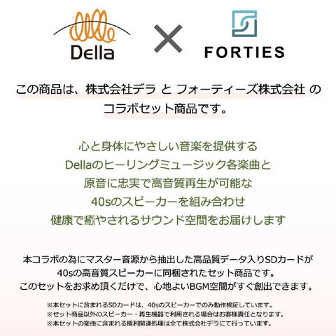 本コラボ商品用にDella社のマスター音源から抽出し制作した高品質データ入りSDカードを、40sブランドのBluetoothスピーカー本体と組み合わせて販売するセット商品となります。