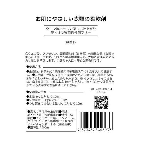 クエン酸、グリセリン、界面活性剤(天然系)の相乗効果で衣類を柔らかく仕上げます。