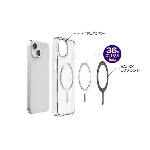 ケースの外側のMagSafeエリアには、上品なブラックラインを採用。表面にはAAUXX製のUVプリントが施され、高級感のあるデザインとなっています。本体はTPU素材を使用し油膜防止コーディングによりiPhoneとの密着を防ぐことでクリアな透明感を保ちます。