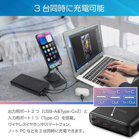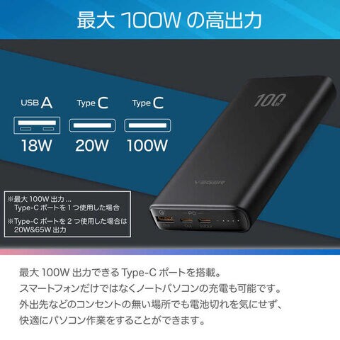 VEGER 正規販売代理店 POWER BANK T100 3台同時充電、最大100W出力 20000mAh 大容量バッテリー