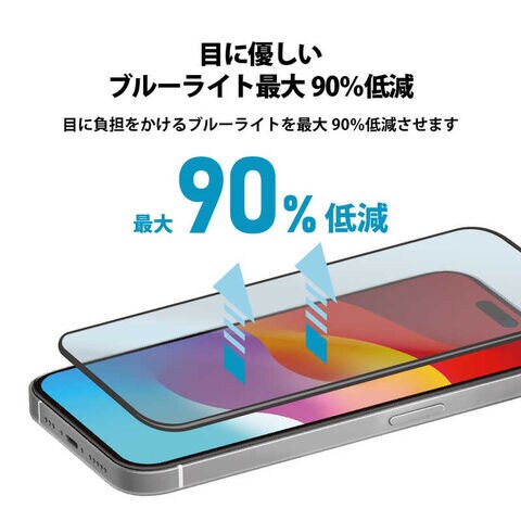 角割れを防ぐふたつの素材を使ったハイブリッド設計のiPhone 15用 液晶全面保護ガラスのブルーライト低減/アンチグレアタイプです。