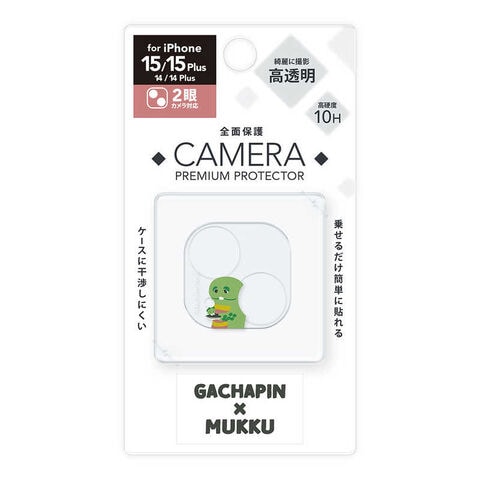 「ガチャピン×ムック」デザインのiPhone 15/15 Plus/14/14 Plus用カメラフルプロテクターです。