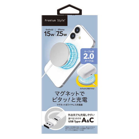 PGA マグネット式 ワイヤレス充電器 USB Type-A&C 2m/ホワイト Premium Style ホワイト PG-MG20CA02WH