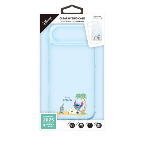 ディズニーキャラクターデザインの着せ替えシートがセットになった2025年 iPhone 6.6inch 1眼カメラ用 ハイブリッドケースです。iPhone本体の色を活かす透明タイプの着せ替えシートは気分に合わせて取り外しが可能です。耐久性のあるポリカーボネイトとしなやかなTPUを組み合わせたハイブリッド設計で端末本体をしっかり保護します。ケースを付けたままワイヤレス充電が可能です。お手持ちのストラップを付けて落下を防止できるストラップホール付き。