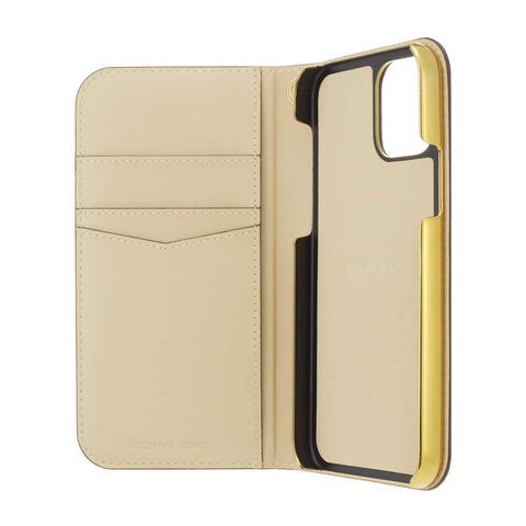 ホワイトカラーのMKシグネチャーのロゴキャンバスとMICHAEL KORSの定番カラーのMKシグネチャーのロゴキャンバスを組み合わせた上品でスタイリッシュなデザインのブックタイプのスマホケース。