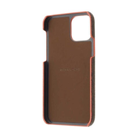 ブラウンカラーのMKシグネチャーのロゴプリントキャンバスで施されたケースのエッジをAWカラーでコーティングしたデザインの背面タイプのスマホケース。MagSafe対応。