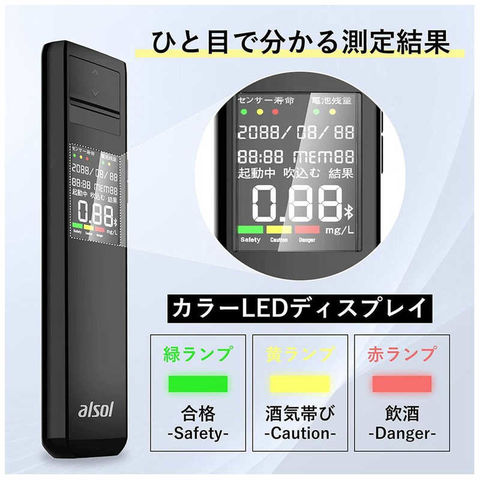 ・ランプ色表示機能:合格(緑)、酒気帯び(黄)、飲酒(赤)という3レベルのランプ色表示で一目で判明する
