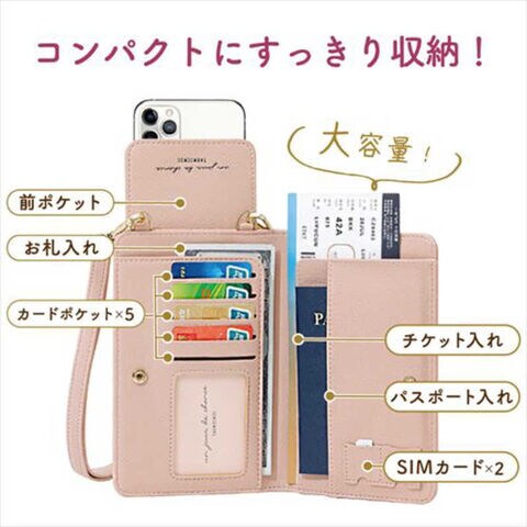 パスポートや各種チケットなどマルチになんでも収納可能なショルダーストラップ付きスマホポーチです。