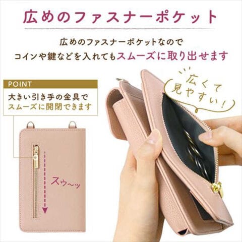 背面にはレシートなど入れられ便利なファスナーポケットが付いており、全面にはマチ付きポケットでさっとスマホが取り出せます。