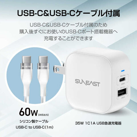 SUNEAST USB急速充電器 35w シリコンケーブルPD対応60W(1m付) 収納ポーチ付 ホワイト SE-AC035CC001WHF