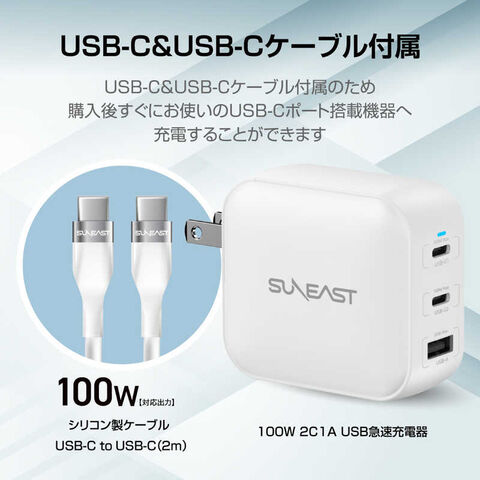SUNEAST USB急速充電器 100w シリコンケーブルPD対応100W(2m付) 収納ポーチ付 ホワイト SE-AC100DC001WHF