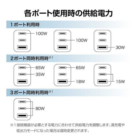 ●スマートフォンやタブレット端末の充電に、これ1つUSB PDに対応し、最大100W出力、USBポートを3つ搭載。