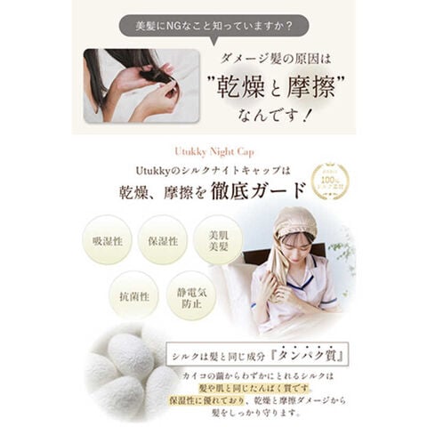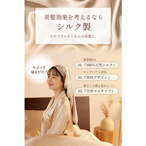 シルクのなめらかな質感が寝返りによる髪のこすれを防ぎ、朝起きたときの寝ぐせを抑えます。