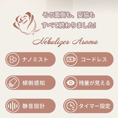 水も熱も使わず精油そのままの濃厚な香りをナノミストで瞬時に広げ、残量が見えるボトル直結&コードレス最大75時間。
