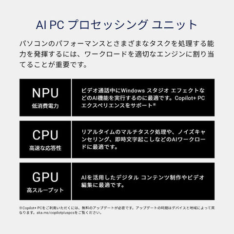 OS:Windows 11 Home ※Copilot+PCの新機能に関しては随時Updateが行われているため、掲載機能に関しては製品到着後、お客様でインターネット接続の上、最新Windows にUpdateしていただく必要がございます。