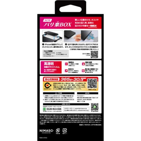 パッケージと一体化した「バリ楽Box」で今まで以上に貼付けがカンタンになりました。フィルムがセットされているバリ楽BoxにiPhoneを被せてシートを引っ張るだけで確実にフィルムを貼付けられます。貼付け前のクリーニングに便利なクロスやホコリ取りシールも付属しています。