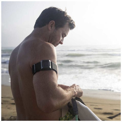 防水性と耐衝撃性を兼ね備えたタグ(送信機)は、アームバンドやウエストバンドに簡単に装着できます。