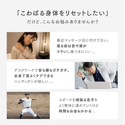 首や肩の浅い筋肉から太ももやふくらはぎの深い筋肉まで、的確な振動刺激で心地よいケアが叶う、業界初のマッサージガンが誕生。