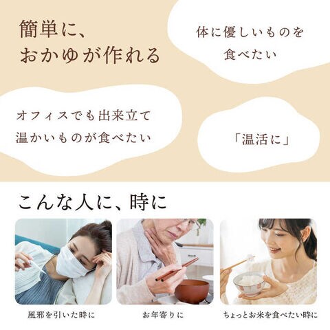 「体調が悪い時、優しいものを食べたい」「少量を食べたい」「オフィスでも出来立てを食べたい」と思ったことはありませんか?そんなあなたに「kayupot」がおすすめ!飲み会の翌日や、ダイエット中のランチ、クーラーで冷えた体にも。