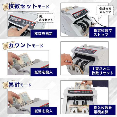 電動オート紙幣カウンターには枚数セットモード、カウントモード、累計モードの3モードを搭載しています。